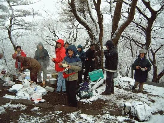 さっそく大鍋に湯を沸していると、11時頃駅からのハイキング組が到着して一気に賑やかになった。銀マットをひろげて腰を据え、食前酒などをやっていると、いつの間にやらバスでやってきた人たちも合流し、やがて荻原氏も二人のかわいいチビスケを引き連れてやってきた。鍋の第一弾ができあがり、舌鼓を打っていると、な、なんと、にわかに丹沢方面から鉛灰色の雲海軍団がインディペンデンス・デイの巨大円盤のごとく上空一面に急来して太陽を遮断、寒風にのせて大量のぼた雪を我々に吹きつけてきたのである。
