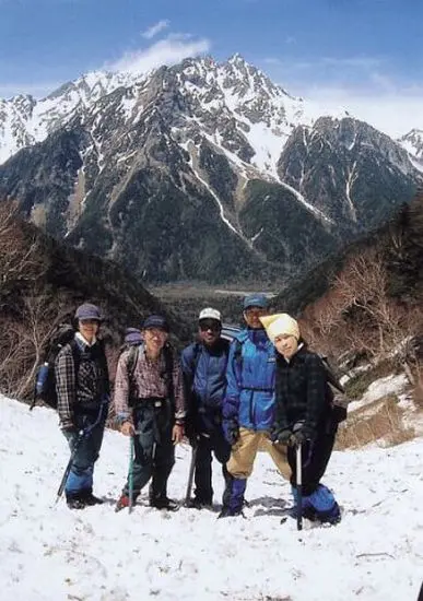 明神館の先で徳本峠への道に入ると、人影はほとんど見なくなる。この道を少し入ったところで小幡氏が追いついてきた。やがて林道の終点から山道になった辺りでようやく雪が道を濡らしはじめた。谷を埋める雪渓がでてきたのは山道を10数分登った辺りからだ。一昨年だったか、野口(芳)氏が5月の霞沢岳を登ったときには林道も雪に埋まっていたというから、今年は如何に雪が少ないかが分かる。雪渓の下部に腰掛けてくださいと言わんばかりに太い倒木が横たわっていたのでそこで一本。さらに登ってゆくと、雪渓上には数パーティーの姿が見えたが、中には運動靴の子供を連れた夫婦もいる。ハイキングシューズの親はよろしかろうが子供の足はたまらないだろうに、などと思いながら踏跡をたどって登ってゆく。雪渓には春の日差しが射しているもののやや風があって、暑くもなく寒くもないといったところ。上空にはすでに青空が広がっていて、登るにつれ明神岳周辺の山々が頭を出してくる。気分良くアタマを空にして登っていると、やや足元が立ってきたなと思った辺りで上から1パーティー下りてきた。この先道がないと言う。えっ、そんなバカな、探し方が悪いんじゃないの、と思ってさらに雪渓を詰めてゆくと、気がついたときには結構な傾斜になっていて、ありゃ? わが頭蓋骨の隙間にかろうじてへばりついているノーミソを急遽かき集めて思考してみると、一般道にしてはきびしい傾斜である。そこで小幡、斉藤、谷川の三氏に偵察に行ってもらってしばらく待ったが、「やはり道はないですね。ここは違いますね」という報告であった。あちゃ~、やってしまった。地図をしっかり見ず何も考えずに登ってきてしまったアタシがバカでした。みなさんゴメンちゃい、引き返します、ということで振り返ると、これが結構恐ろしげな角度に下が見えるではないの! そろりそろりと慎重な足取りで傾斜のゆるくなるところまで何とか下りて水をゴクリ。しかし結構上まで登ったので、見えた景色は素晴らしかった。蝶、常念、大天井などの蒼と白の峰々が目の高さにあった。標高差にして百数十メートルといったところだろうか、少しく下りたところの雪面に赤スプレーのマーキングがあった。よく見ると、その横の右岸の枝沢入口の雪壁にも赤スプレーの跡が薄く残っていた。これを見逃していたのだ。ルートはこの右岸の沢に入らねばならなかったのだ。しかし後の祭り。時計の針はもう12時半を指していて、このとんだ敗退にみんなの気分もそがれてしまい、徳本峠よまた来るからな、いい子で待っておるのだぞ、ということになり、くやしいくらい景色がいいので敗退記念に、そこで明神岳をバックに皆で写真を一発かましたのであった。これがその写真である。
