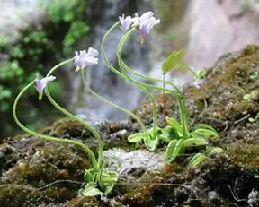 その中ほど、岩戸庚申の祠のところで山沢女史が早速コウシンソウを発見する。モヤシのような高さ5cmほどの花ではあるが、思いのほか小さく目立たない。そして写真を撮ろうにも高度感あふれる岩角に咲いているため、おいそれとは近づけない。やはりコウシンソウはシロートさんお断りの花だ。