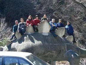 すぐ側にコンクリート造りの恐竜ステゴサウルスの像があった。福間さんが、すかさずそれに登った。釣られて皆も登る。結局、皆で像に登って写真を撮る。まるで悪ガキ(ただし平均年齢は50うん歳?)だ。