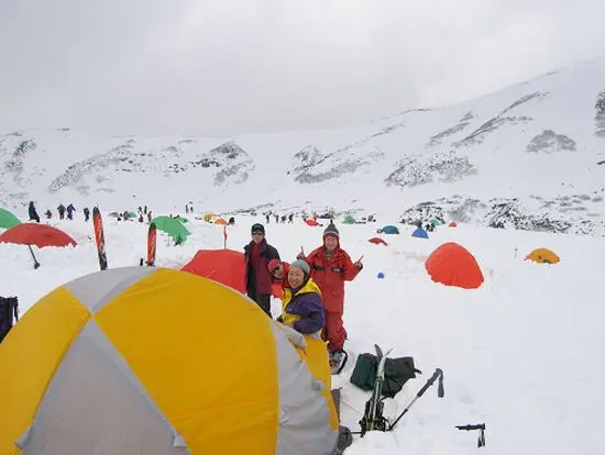 「岳人」2004年12月号の丸山剛氏の記事にもあるようにここにはトイレがない。このシーズンの人の多さを考えると本当にトイレを設置して欲しいと思う。テント村といえる数のテント1張りごとに1トイレがそれぞれあちらこちらに作られているのが現状である。テントを設営して中で休憩していると、くつろいできてしまうので出発時間を決定し、まずは手軽な新室堂乗越に行くことになった。アルミ板のような橋で川を渡り向かい側の斜面を登る。テントから1時間半位で上に着くが雪に埋まっていない岩が結構あちらこちらに見受けられる。室堂乗越の方へ行き雪の多そうな所を滑る。いよいよ今シーズンの初滑りである。わりと楽しい斜面だったが、あっという間に下に着いてしまった。