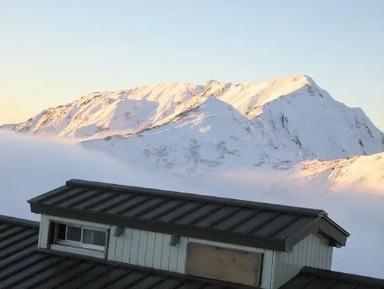 ここからが本来の目的である温泉山行となるのである。リーダーはテントの時も雷鳥荘の温泉に入りに行くつもりのようだったが停滞日もなく実現しなかった。みくりが池温泉は日本で一番標高の高い温泉とのこと。設備は山小屋というよりはホテル並みで、いい温泉だった。その後は喫茶室で夕日を見ながら生ビールで乾杯。シーズン初めからこんな山スキーが出来るとはラッキー!!
