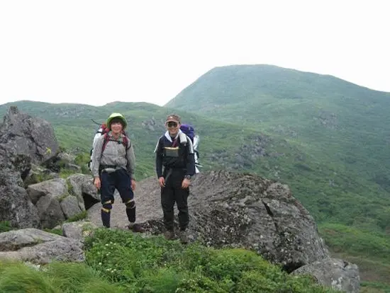 17日(日)08:40焼石沼を出発し山頂へ向かう。ガスに包まれたミヤマキンポウゲの咲き乱れる幻想的な道を歩く。09:15九合目焼石神社に到着。山頂での集合時間まで余裕があったので、荷物を置き南本内岳まで足を伸ばすこととする。雪渓のすぐ横の湿原にミズバショウが現れる。他にもシャクナゲ、トウゲブキ、ツリガネニンジン、ハクサンフウロ、イワイチョウ、ウスユキソウ、リンドウ等の花々が咲いている。09:55南本内岳に登頂。帰り道のガスの中で田原さんのヨーデルに反応があり、湯田口から登ってきた江村(し)さん、勝部さん、冨岡さんのパーティーに遭遇する。焼石神社に戻り、山頂へ向かう。急に傾斜がきつくなり、岩も多くなり歩きにくい。11:00焼石岳山頂(標高1,548m)に登頂。