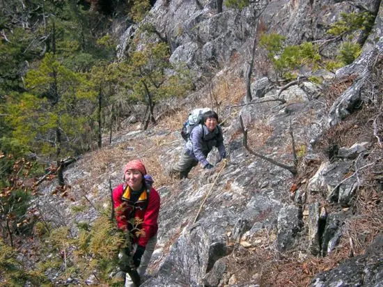 赤岩岳より東に向かって赤岩尾根の縦走を開始する。1583m峰の前衛峰はどこを登るんだろうと迷ったが北側に回り込んだ所にフィックスロープがありこれを登る。赤岩尾根は結構人が入っているようで踏み跡もしっかりしており、要所には必ずフィックスロープがあり縦走の助けになっている。岩稜帯は眺めがよく小倉沢の集落も手が届くような近さに見える。