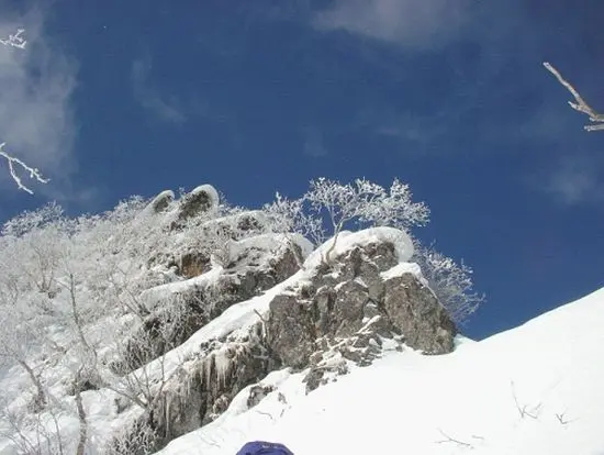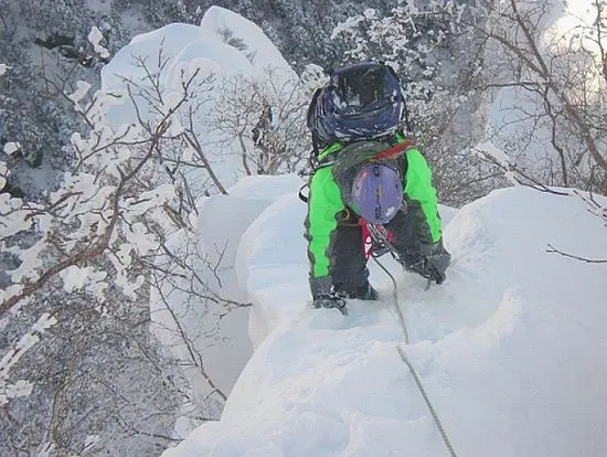 翌朝も快晴。4時起き、6時出発としていたが、明るくなるのを待ち、7時出発。1箇所リッジ状でクライムダウンする箇所があるものの、残置ロープがあるので、ザイルを出すまではいかない。トレースもありリッジ状の尾根を進んでいくと、尾根が広がると同時に、ついにトレースが消えてしまった。ここから、今日一日ラッセルに終始することになる。寒気が入り、気温が低いこともあってか、パウダー状のさらさら雪で何度も踏み固めても一向に固まらず、もがきながらの登行が続く。すぐ先に五段の宮の基部が見えているのだが、なかなか前に進めない。ラッセル開始から2時間あまりでようやく基部までたどり着いた。