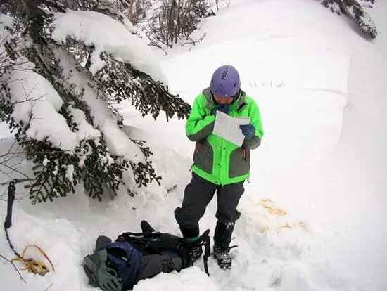 翌朝、マルタイラーメンを朝食に作る。これを作るということは相当ヤバイということである。学生の時から非常食はこれかオートミールだったが、久しぶりに食べた。うーん微妙な味。いよいよガスもほとんど無くなり、今日中に下山するぞ!と出発。30分ほどでツルネ東稜の分岐に到着。赤旗の支柱のみ立っており、今年のように雪が多い年はテープは埋まっていたかもしれない。下りもトレースなどなく腰ラッセルである。短間隔で赤テープがうってあるが、支尾根が入り組んでいるため視界が悪いときには注意が必要である。出合小屋に向かって左左にライン取りをする。途中、垣添尾根を登ってきたというパーティーにトップを代わってもらい、2時間半で出合小屋到着。デポしたわかんをピックアップし、林道を駐車場まで引き返した。