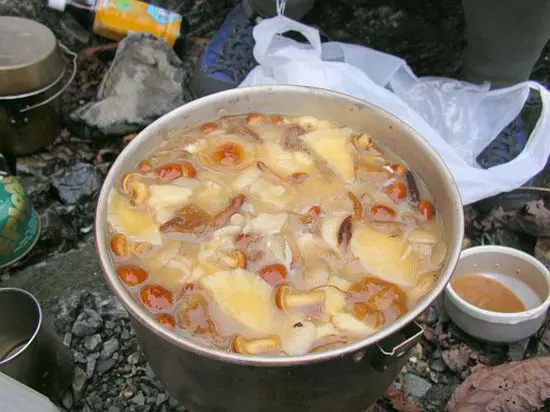 荷物を降ろし箭内、高木の両名は車を1台会津駒の登山口へデポするために檜枝岐へと向かった。今日は沢へは入らず明日登ることにしていたので残った者でテント設営後、薪集めに精をだす。小雨が降りだした中、焚き火も何とか燃え出し二人が帰ってくるまでキノコでもと探してみるとそこそこ採れた。小幡、荻原、高橋の3名は赤柴沢を辿って大沢岐沢の出合まで行ってきたそうだ。帰ってきた二人も途中でキノコを採ってきたのでその日は旨いキノコ料理を堪能できた。