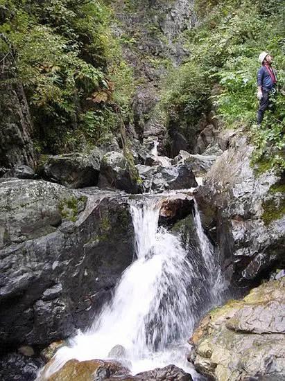 ゴルジュを行く  第3ゴルジュに入ると、霧雨も降ってきて薄ら寒く、日暮れも近くなり、先を急ぎたくなる。しかし沢は、より小滝が現れ、美しさが増してくる。夏の日差しの中ではワイワイ言って、シャワークライミングを楽しめそうな所だ。また、奥の二俣までザイルを出した滝は7本位あったが、全て長さ15mのザイルを使用し、30mザイルは使わなかった。