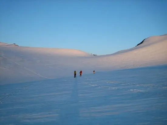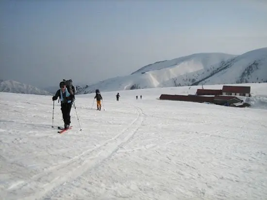 さて、今日の行程の長さを思い、5時発と早出のつもりです。(5時もちょっと遅かったようだ)小屋を出発すると、あたり一面まばゆいばかりの真っ白な雪原です。シールを効かせて一歩一歩登って行きます。