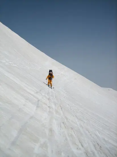 こえー、下を見ただけで縮み上がります。フォールラインにスキーの先を向けたらまっさかさまに落ちていきそうです。横滑りで、ズリズリと雪を削りながら高度を下げていきます。竹内さんが、コケたら数十メートルずり落ちてしまったと話していました。怖いとこでした。