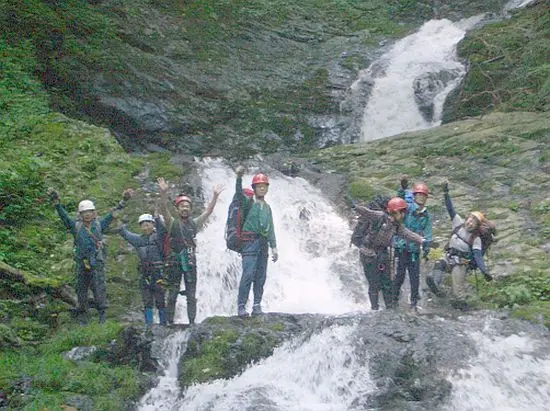 ああ、ここだここだと安心して進み始めたのもつかの間。核心部のS字峡の手前まできた時、突然雨が降り始めた。それも結構激しく、雷まで鳴り始めた。両岸はゴルジュで、逃げようが無い。野口氏は夕べあまり寝ていないはずなのに、一人元気に泳いでいた。野口氏の元気に励まされ、早く抜けきろうと先を急いだ。核心部のS字峡は結構水量が多く、下から見ると、懸垂をした後のへつりが難しそうだった。大高巻きしようか、へつってみようか迷ったが、通常のルートどおり右岸に上がり、上から覗いてみると下から見るほど難しそうでもないことが分かった。時間はかかったが、全員懸垂とへつりで無事核心部を通過した。人数が多いのでザイルを出すと時間がかかる。それでも、大高巻きの方がもっと時間がかかりそうだったので、良かった良かったと一息ついた。その後も結構な滝が続いて気を抜けなかった。安齋氏のクライミング技術に助けられながら進んだ。長い沢なので、最低中ノ沢までは進んでおこうと、頑張って歩いた。やがて前方に焚き火の匂いがし始め、幕場が近いことを教えた。先行者が3人もうすっかり出来上がっている様子で、