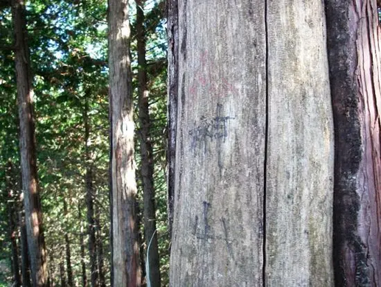 ここには山名板などは無くて三角点のみかと思っていたのですが、「ここに榊山って!」という歓声が。なんと木の表皮に薄く三角点のマークと「榊山」と書かれていました。なんとも木に優しくない山名木なのです。展望もない山頂には皆さんあまり興味がないようで、私も先を急いでいたのでさっさと長沢山を目指します。