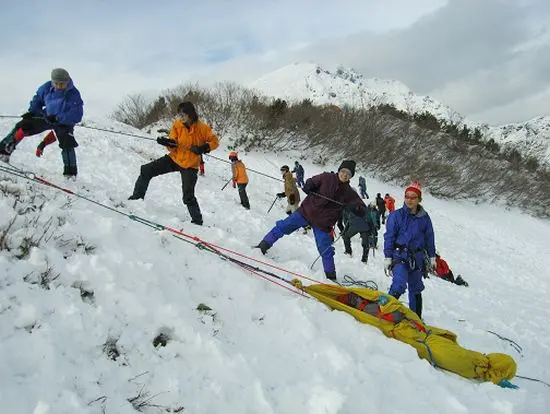 そして訓練カリキュラムに沿ってロープワークへ。最初は腰がらみによる確保。ロープを強く握ると急激に制動がかかり自分も引き込まれるため、手の中でロープの経路をねじるように弱い制動で徐々に止める方法を全員で練習。ロープには触れるのも初めてという人もいたが、皆要領が良く、スムーズに習得出来た。ところが次のスタンディングアックスビレーは積雪量が少なく、ピッケルのシャフトを首まで突き刺す事が出来ない。それでも何とか短いピッケルを叩き込み、全員で形だけでも経験。こちらは復習が必要なようです。
