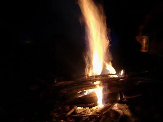 笹の湿地帯の三方窪を通りトラバースの高低差の少ない登山道を足早に歩いたものの樺沢分岐までは、思った以上に長く感じました。それでも、このあたりから目にするようになった昔ながらのブリキ板の大井川鉄道の案内板に目を留めながらようやく15:20に分岐に到着。ここからは、エリアマップの実線に変わることから安心し今晩の焚き火を楽しみにして一気に下り切ろうとしたのですが、次の鞍部から樺沢登山口までの広い下りの尾根は、思いがけずルートファインディングを要することになってしまいました。ここが、本当に実線なのかと疑うほどでしたが、下りてみればルートに間違いはなかったと思われ、きっと今は、ショートカットの大樺沢登山口からのルートが、主ルートに変わってしまい、林道を1時間近く多く歩かなければならないこの樺沢登山口からのルートは、ほとんど利用されていないのだろうと思いました。時間も17:00前で少し薄暗くなり始めていたので、早速焚き火の準備をして、登りのルートとは一変した紅葉まっ盛りの中、男同士3人の宴会となりました。