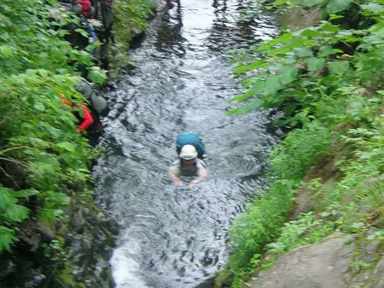 銚子大滝を越えるとその先は沢幅が狭まりちょっとしたゴルジュとなる。ゴルジュの中に大きな滝はないが深い瀞や小滝を越えていくのが面白い。きわどいへつりを強いられる所では一人また一人と瀞の中へドボンと落ちる。落ちたところで危険はないので皆笑っている。落ちるくらいなら最初から泳いだ方がよいとばかりに泳ぎだす者もいる。小滝を水を浴びながら越えると短いゴルジュも終わりブナ林が広がる。左岸の一段高くなった所によい幕場があったので今日の行動を終える。