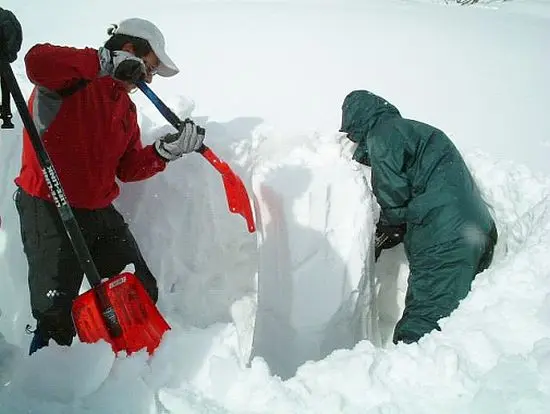 次に、弱層テストの訓練。斜面に穴を掘り直径70センチ高さ1.5メートルくらいの円柱を作って、それを両手で引っ張る、というものです。ずるっという感覚で雪がずれるのが体感できました。