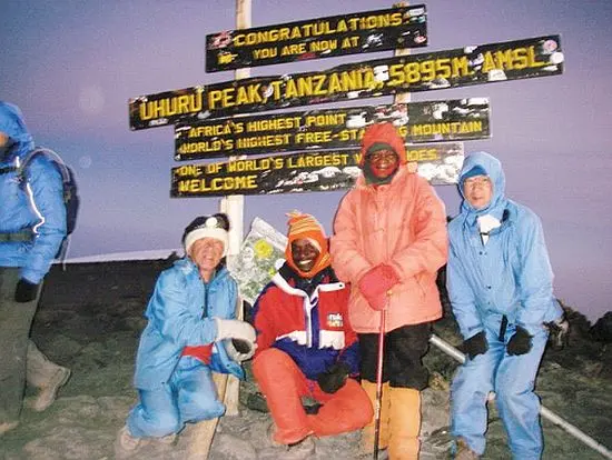火口は真っ白く雪に覆われまさに朝日に染められピンク色に輝いている。ウフルピークに向かうと、左には大きな雪渓があり、氷塔の間を行くようになる。やがてピークを示す標識が現れる。突然後藤さんが声をあげて私とフレディを追い抜いて走り出し、山頂の標識に抱きつく。涙を浮かべている。ステラポイントについてから涙が止まらなかったという。海外初登山、初めての山頂でよほど感激しているのだろう。そういえばさっきから何となく言動が普通ではなかった。