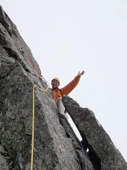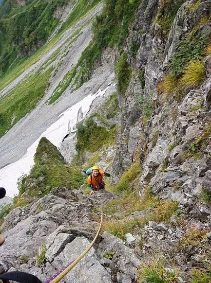上記9名の他に既に先行パーティーが取り付いており、当分順番は回って来そうにない。取付へ向かう途中よりガスは晴れ、青空も見えてくるが滝谷は西日が差す夕方まで日が当たらないので非常に寒く長い長い順番待ちとなった。約2時間半で漸く順番が回ってくる。11時登攀開始となるが、全5ピッチと短く比較的易しいルートなので焦りはない。傾斜は結構あるが、ホールド豊富で岩も硬く予想通り簡単なピッチが多く快適そのもの。3000mの高度感も素晴らしく、7月に集中した槍平小屋も良く見える。ガイドパーティーに不慣れなメンバーがいたので途中も順番待ちがあったが、それでも取付から僅か3時間で終了点に到着。ちょっと物足りない感もあったが、竹内君は充実したようで喜んでいた。その後北穂山頂に立ち、長い長い南稜を下り、本日はヒュッテではなく小屋の生ジョッキで乾杯。明日は午後より崩れるとのこと。明朝3時の出発に決める。
