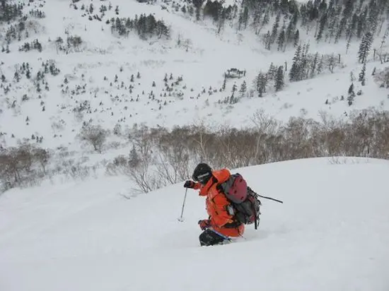 目指す反射板尾根は神楽が峰のピークの100m手前から滑り出す。11時出発。上部は少しクラスト気味だが、木が出てくると柔らかな雪質となった。しかしゲレンデのフラットで潜らない雪とは全く違うため、渡辺さんは悪戦苦闘の連続だ。横滑りやキックターンなど、ゲレンデでは忘れられている基本技術も山の中では重要だ。最後は沢の中を滑り、12時50分、田代第8ロマンスリフトのベース着。お疲れ様でした。