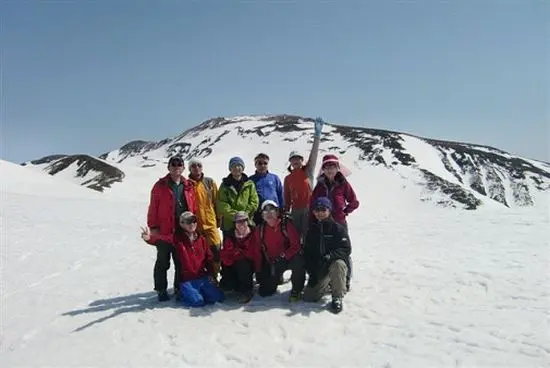10人がそれぞれのペースでパラパラと到着。全員揃ったところで記念撮影し、行動食を摂ったり、シールを外して滑走準備をしたり。これで今日の登りはおしまい!あとは滑るだけ!と思うとワクワクしてくる。天候も良く稜線が見渡せるので、気持ち良く滑れてルーファイもしやすそうだ。
