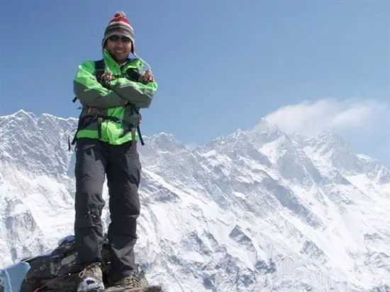 ガイドもこんなシュルンドは初めて見るという。スイス人パーティーも同様に立ち往生しておりお互いに協力してルート工作することとした。スイス人パーティーのガイドとウチらのガイドでルート工作開始。スイス人パーティーのガイドがトップでルートを切り開いていく。核心のシュルンドも苦労しながらもアイススクリューを要所々々に効かせ微妙なバランスで突破した。リッジまで約200mほどFIXロープを設置。残りのメンバーもこのFIXを使いユマールで登るが足元が針山化しているのでこれでもバランスを保つのが難しい。このシュルンドでどのパーティーも敗退したようだ。リッジ上に上がるとピークへ導くようにここもFIXが張ってある。ここは非常に急峻なリッジなので足元には注意が必要。リッジを慎重に詰めていくと、タルチョーが見えてきた。11:00アイランドピーク登頂。無風快晴、感激のあまり男泣きをしてしまった。