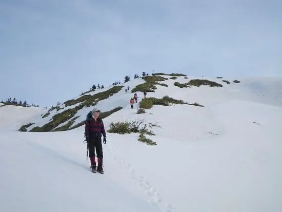 踏み跡をたどり一旦ハンノキ沢に降り立ちます。立派な木橋があってほっとしました。以前の記録ではよく流されていて、寒い思いをして渡渉という記録もあったので助かりました。木橋を渡り少し下流に向けて歩くのですが、踏み跡が結構な斜面を登っていて、それを追いかけたのですが、明らかに無理やり登った感じで、アイゼンが必要なくらいの斜度でした。もう少し先にいけば夏道があったはずですが、期せずして出だしの大運動会で結構体がほぐれました!通常のルートに合流し、一本入れて地蔵峠を目指します。