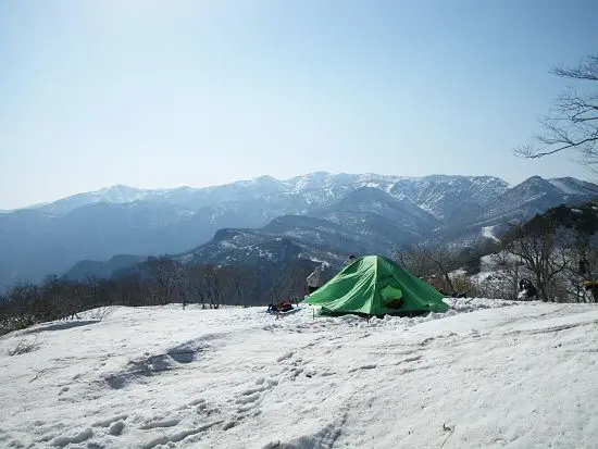 15時前くらいに堂岩山手前の堂岩の泊場到着です。荷物も今日はみんな重いのでここで予定通りに幕営を決定致しました。やはり地名が「泊場」なのであるから、泊まるべきなのです!夏場は少し下ると水場もあるようです。ジャンボテントをすぐに設営し、テント内で7人分の15リットル程の水を作っていると4人パーティが現れ、「水場はどこですか?」と聞かれて、「多分雪に埋もれて・・・」という返事しかできませんでした。ちょっとびっくりしましたが・・・。彼らは堂岩山で幕営したようです。本日の食当は私で青椒牛肉絲です!レトルトだけでは申し訳ないので、少しピーマン、タケノコ、お肉を持参しました。無洗米も美味しく炊けてよかったのですが、7人で3.8合では少なかったようです。今後は気をつけたいと思います。