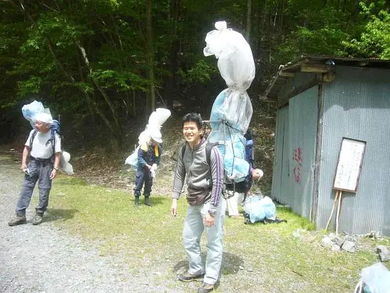 無事に荒沢橋に到着し、総勢16名が揃いました。皆さんと荷物の割り振りをしていると、明らかに大きなブナの苗木の束が置いてあり、これは背負わないとまずいなあという空気が流れていたので、背負子を初めて使って背負ったのですが、ザックと一緒に背負ってみると明らかにバランスが悪く、多分合計で30kgは超えていたかと思います。身長の倍くらいの高さになりました。立ち上がるのが本当に大変でした。