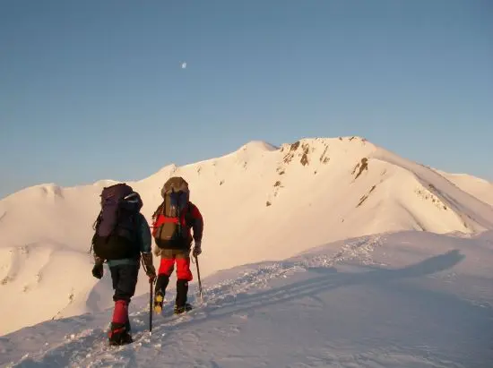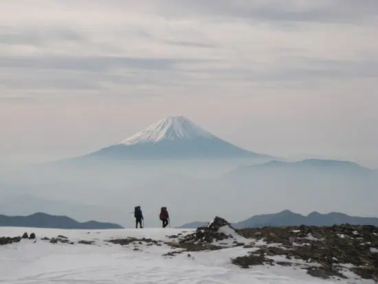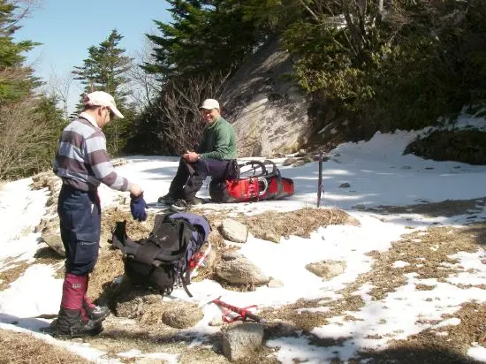 初日の重い荷物を持ってズンズン登ります。途中、七丈小屋のおじさんが、ワカンなんて置いてきたらよかったのに~と言い残し、軽い足取りで過ぎ去っていきました。今日は五合目までは行けないし、途中に雪もないだろうと、笹の平分岐にザックをデポして粥餅石付近の水場へ。地図には”涸れること多し”と書かれていたので、ちょっぴり不安だったけれど、水音が聞こえ、細いながらもしっかり流れていてホッとしました。分岐に戻った時には15時を過ぎていて、分岐道標直下を幕場としました。街の灯りが近く、暖かい夜でした。雪のない所で寝られるのは今日で最後かなぁと思いつつ就寝。