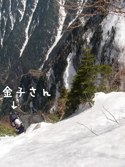 大門沢下降点までは尻セードを駆使して楽チン下降。金子さんによると、農鳥岳~大門沢付近は例年より雪が多いそうです。大門沢は雪崩の恐れがあるため、近くの樹林帯を下ります。金子さんのアイゼンにはアンチスノープレートがついていないため、大変そう。わかんに履き替えたら楽になるかもと試していましたが、上から「あっ!」という叫び声の後、なかなか追いついてきません。効果はなかったようですが、せっかく持ってきたのだから、一度でも使えてよかったよね?