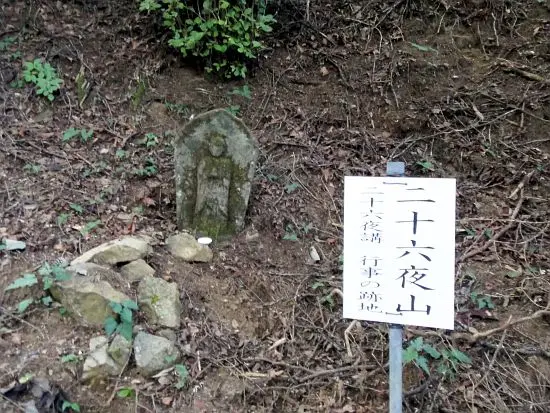 8時前に下山開始です。下りてすぐの広場にはお地蔵さんと『二十六夜講 行事の跡地』と看板があり、実際は山頂ではなくこの広場で宴会をしていたようです。今は樹林に囲まれて空は見えない感じです。