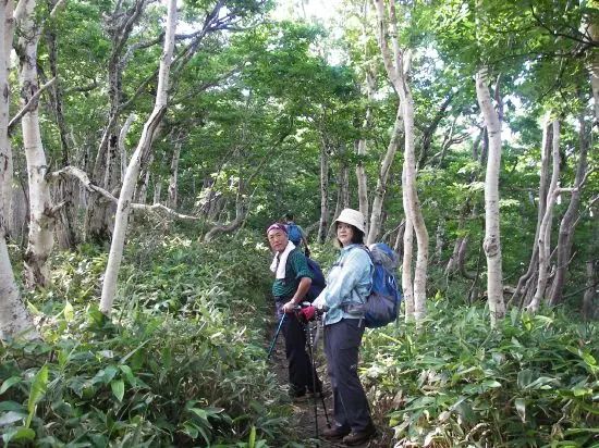 そういえば、昨夜は食事の後のゴミをうっかりテントの外に出しておいた。そうしたら夜中にキタキツネが来てゴミをあさっていた。原口さんがそれに気づきゴミを始末してくれたのだ。岩尾別温泉、ホテル地の涯の脇を抜けていくと木下小屋があり、登山口だ。原口さん、澁谷さん、箭内の順に登っていく。恵那山で原口さんは両足をつってしまうというアクシデントがあったので、今回はダブルストックである。澁谷さんもダブルストックだ。さて、出発だ。