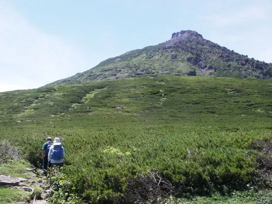 新道コースが合流する上二股ではゆっくり休憩する。低木の中を登っていき、胸突八丁と呼ばれる急斜面をがんばって登り、馬の背へ出る。ここまで来ればあとひと登りで程なく山頂です。