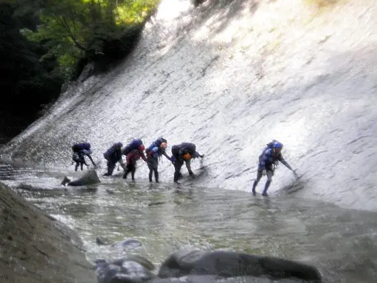 4時過ぎには起き、6時過ぎには出発です。気合いが入ります。出発してすぐに大きな釜が現れます。銚子口です。越えるとゴルジュが始まり、釜や小滝が続きます。首まで浸かる渡渉も出てきます。