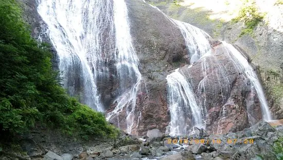 入渓後、1時間ほどで大滝が姿を現した。デカイ!!高さ120mと言われているが、高さも然ることながら、幅も40~50mはありそうだ。今までこれほど大きな滝をこんなまじかで見上げたことがあっただろうか。岩肌をこぼれ落ちるよう流れる滝は今まで私が見てきた滝とは明らかに異なっていた。しばらくの間、何も考えずにただ滝を見ていた。