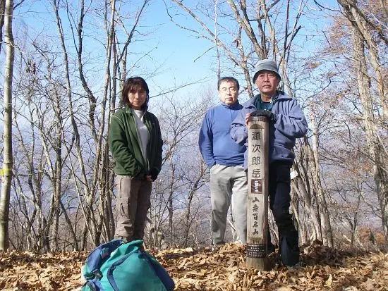 取り付きから2時間強で、源次郎岳と恩若峰を結ぶ尾根に合流する。キリガ尾根方面にはロープが張ってあり「この先作業道」のプレートが掛けられていた。ここからは一般登山道なみに明確なルートとなるが、傾斜はきつくなり、息が上がる。片斜面が切れ落ちた箇所も出てきて、キリガ尾根ののんびりモードから一転するが、ほどなく源次郎岳頂上に着いた。山頂は広く展望も良い。ふたたびのんびりモードになってまったりとする。