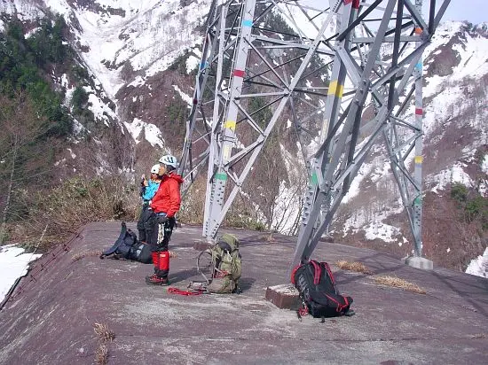 吊り橋は頑丈そうで安心感がある。2005年の記録を見るとこの橋はかなり歪んでいて逆S字のように見えるが今は真っ直ぐになっている、修復されたのだろうか。渡り終える直前の所で板が折れているが特に問題はない。吊り橋を渡り終えるともうそこがガンドウ尾根の末端だ。いきなりの急登で始まる尾根のどこから取り付けばいいのか迷う。吊り橋正面の急なルンゼは上まで雪が繋がっているが急過ぎて我々には厳しい。吊り橋から左(上流方向)へ雪の斜面をしばらくトラバースして行くと幅の広い浅いルンゼ状の斜面に出るのでここを登って1つ目の鉄塔を目指す。更に上の2つ目の鉄塔を目指して登って行くと夏道が出てくる。水平に付いている夏道を突っ切り2つ目の鉄塔まで登ると少し藪っぽくなってくる。