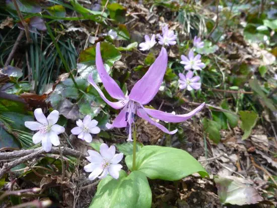 組禿と呼ばれる芝生の広場に着くと前方に金剛山の頂が見えます。いざ山頂へと進みましたが、高度700mからは雪が山の斜面全面を覆っています。おじさん2人は雪を見たとたん「箭内さん戻りましょう」と強く主張します。今回の目的は花見山行なので、雪の山は遠慮し、戻ることにしました。登ってきた道をまた、花の写真を撮りながら戻ります。カタクリの群生、イワカガミの群生等々、花を楽しんだ金剛山でした。