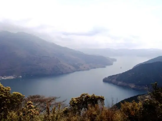 三国山を降りて、山伏峠に向かう道が緩やか。大きな岩を抱え込んだブナをくぐって、すぐ側に山伏峠の標識があった。しばらく尾根を歩くと、何十人もいた団体に遭って、山走りの人たちもいた。箱根峠から来る人が多いらしい。山伏峠を通過すると、展望台に出て、レストランがある。ここの展望台から芦ノ湖が見えて、家族と撮影の人が多い。芦ノ湖スカイラインと並行する尾根を歩き、時々自動車とバイクの音が聞こえる。スカイラインの料金所の横を通り過ぎると海ノ平に出る。広い草原の中の一本道となって、遠くに二子山が見える。