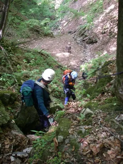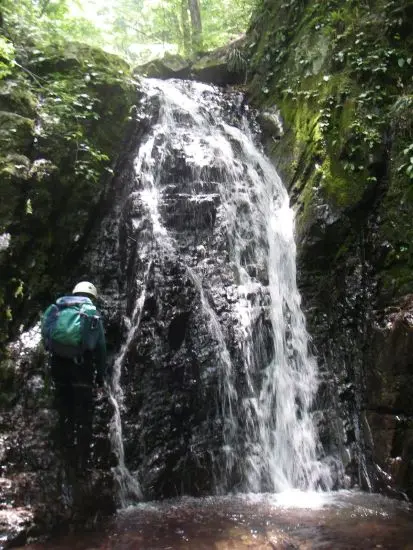 しばらく進み3-4メートル程の小滝を越えて行くと6メートルくらいの大きな滝に出くわした。初心者組は迷わず巻く。今回は沢の予習みたいなものなので様子を見るだけでいいや~というへたれな思いだったので難しそうなところはリーダーにお助け紐をだしてもらいどんどん巻いて行った。すると歩き始めてから45分ほど経った頃に目の前に5メートル程の滝が出てきた。リーダーが最初に慎重に登りロープを垂らしてくれた。