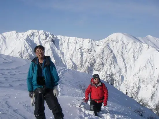 予定通り周回ルートを行くことにする。「先は長いよ。さあ、急ごう!」アッコさんのかけ声で山頂を後に。なだらかで広い尾根を気分良く下り、南に方向を変えて下りるとコルに出た。ここは前回三峰隊が来た時のテン場だったそうだ。来る前にその記録を読んできたのだが、ここからの記述は簡単に書いてあったので簡単に考えていたら、ここからが大変だった。武能岳への上りは相変わらず雪深く、ラッセルの順番もまたまた早い。武能岳から次の1,482mピークへは細かく上り下りがあり、思っているより時間がかかりだんだんうんざりしてくる。動物の足跡しかない雪面。雪屁がかなり発達している。下りはシリセードを試みるが雪が深く重く滑らない。メドの経たない行程に疲れてヤケクソ気味、悶々と歩いていると1,391mを越えた辺りで突如トレースが現れた。逆コースから登ってきた人がいたらしく、整地した跡もあった。これに元気をもらい、スピードを上げたら赤沢山に着いた。ここからはトレースがいろんな方面に付いており、最短コースで下りるべく地図と森田さんの新しいGPSを頼りに2人で先に下りることにした。最後の下りは急斜面を深くて固まったトレースに足を取られながら転がるように土合山の家の裏に下りた。やれやれなんとか日が暮れる前の下山ができた。