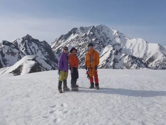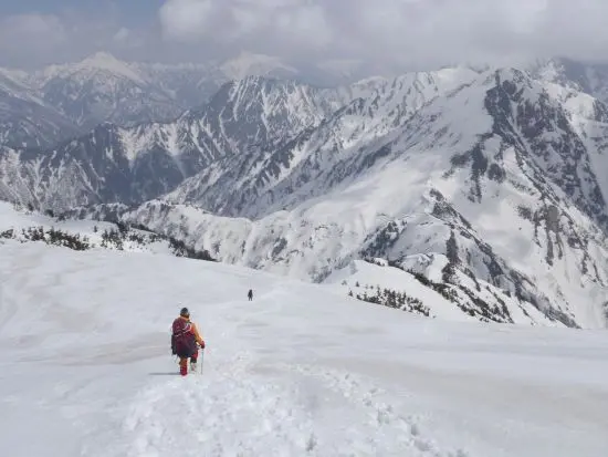 いよいよ毛勝山へ登る為に、噂の「天国の階段」を登る朝がやってきた。西谷ノ頭から約500mの登りは、なるほど天国への階段というネーミングの理由が納得できる、斜度のあるきつくて長い登りである。初めは3人交代で登っていったが、天気がいいと、テンションが高まるらしい?ナベちゃんが途中から先頭でガンガン登っていく。荷物も一番重たい筈なのに凄いパワーである。標高が高くなるにつれ、更に硬雪の急斜面になっていき、またガスも出てきて視界がきかなくなってしまった中、終わりがないようなこの階段をとにかくアイゼンを蹴り込んで登り続けていった。そして最後の一登りという場所で、後続していた2人パーティーが「今頃ですみませんが先頭を代わります」と言ってきた。ここでなの?!と思ったが、1人がどうやら新人らしく、疲労困憊といった表情ながらも申し出てくれたので、先頭を譲ることにした。こうしてガスの中ではあったが、無事に毛勝山北峰に登頂。だが、視界がまったく利かなくなってしまったのでその先の南峰へは、地図とコンパスを合わせて慎重に登っていった。その後、釜谷山に向かっている最中にガスが切れだし快晴となり、360度の素晴らしい景色と稜線歩きを満喫することができた。