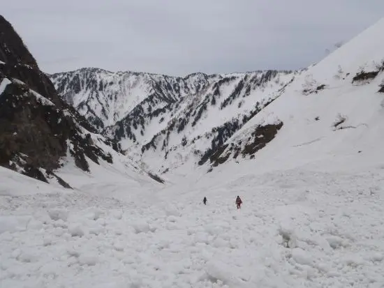 朝から3人共既に下山モードになっていて、途中で尻セードも混じえながら、平蔵谷を一気に真砂沢へと下りる。途中の剱沢との出合付近は、物凄いデブリの山となっていて、今冬の雪の多さを物語っていた。