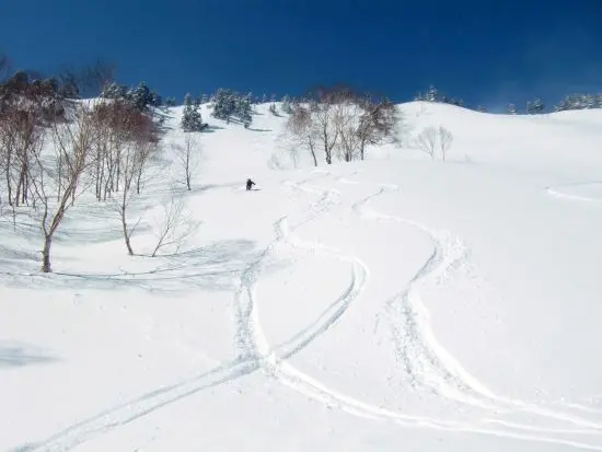 2本目は目いっぱい左から滑ることにする。斜度は30度程度で少々重めの新雪でちょうど良い。Iさんはいつも先を譲ってくれる。お先にどうぞ、と言われて、1本目のシュプールを右に見ながら飛び込んだ。でもその先は、谷が狭まり斜面も急になってくるので、結局、右へ右へと方向が変わり1本目で一休みした同じ場所に出た。そこからはまたやや左に方向を変え、斜度が急に変わる手前の木がまばらに生えている所で止まった。そこは丁度斜度の変わり目で、その先は、今思えば雪崩が起きやすい正に雪崩地形とも言うべきところだった。100m程先の疎林まで行ったら一休みしようと、滑るルートを考えながら下を覗いていると、Iさんがまた「お先にどうぞ」と言ってくれる。ありがたい。