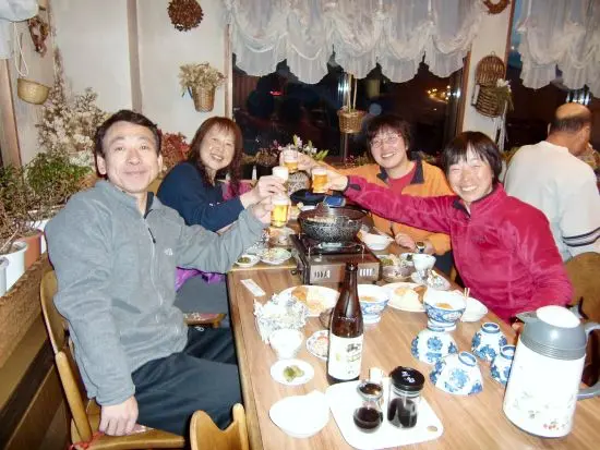 今夜の宿は、Iさんが古くから居候としてバイトしている発哺温泉「リバティ」。オーナーもバリバリのスキーヤーとのこと。志賀高原の穴場のBCエリアをよく知っているというから、これはお友達にならねば。オーナーとIさんのご好意で、しっかり男女別に1室ずつ用意してくれて、モキチは寂しく一人寝(女性勢は助かった?)。夕食後はIさんが加わって飲んで食べて、記憶もさだかでなくなった頃、オーナーが赤ワイン片手で部屋に来たのでまた飲んで・・・。宿泊ってやっぱり気楽でいいな、とつくづく思った次第。