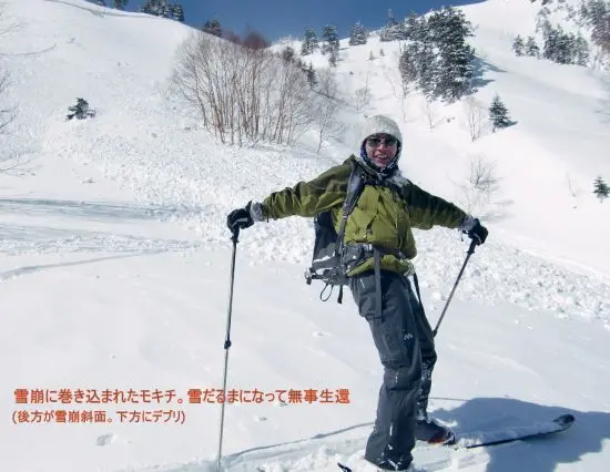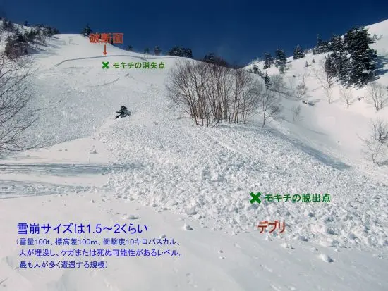 私はその時にモキチの姿を見ていなかったので、てっきり「自然発生雪崩」だと思った。前方に雪崩が見えたので冷静に反対側へとターンして回避したが、後で聞くと千明は私が雪崩に気づかず突っ込むと思って大声をあげたそうだ。千明のところまで滑り降りて初めて「モキチが雪崩に飲み込まれた」ことを知った。だが、幸いにもモキチはそこに雪まみれで立っていて、無事脱出していた。雪崩はモキチが滑り込んだことによる人為的な発生だと知り、唖然としてしまった。雪崩発生時刻は12時。とにかく無事で何よりだった(雪崩レポートの詳細、目撃者としての千明レポート、遭遇者としてのモキチレポートは後述参照)。
