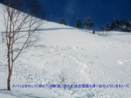 今回の山行で貴重な雪崩の全容を見る事が出来たので、記録を残しておこうと思う。一番目に滑降した私は、二番目に滑降してくる茂吉の滑りを見ようと中央の樹林脇で向かって右側の斜面を見ていた。右側の誰も滑っていないフレッシュバーンを、相変わらず斜面を蹴散らすような力強いターンを決めて茂吉が滑ってきた。2ターンが終わったあたりで「あっ!」と息を飲んだ。茂吉の滑っている上部にサーッと亀裂が入り、上部の5mくらいは斜面がスコンとずれ落ちるような感じで落ちた。と同時に、茂吉の滑っているあたりの雪面が波を打ち出した。向かって左のバーンを茂吉から少し遅れて滑ってくる邦子は、右ターンを終え右側の雪崩斜面に板の方向が向いている。