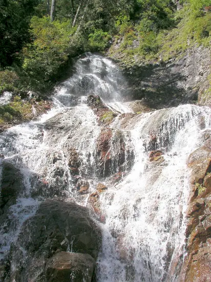 しばらくは滝もなくゴーロ帯が続く。ナメ滝を二つ越えると赤岩沢に二つある大滝の内の一つ、赤岩の大滝 2段35mが現れる。下段は簡単に登れるが水量が多いので上段はシャワークライム必至だ。滝の左側の浅いルンゼ状を登る。ここも水が流れているが灌木が上まであるので容易だ。