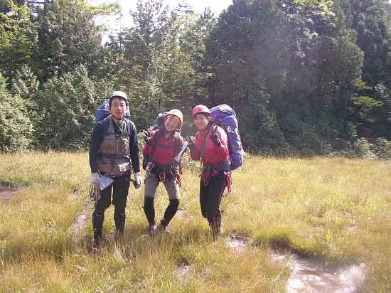 小滝を2、3越えるともう一つの大滝が現れる。50mはありそうな大滝で2段になっている。登る気はさらさらない。さて、どちらを捲くかが運命の分かれ道である。右にも左にもルンゼがあり捲くならどちらかのルンゼを登るしかないようだ。左のルンゼは一直線に続いており水もジャンジャン流れているし傾斜も強い。右のルンゼは途中で二俣になっていて同じく水は流れているが左のルンゼよりは傾斜は緩い。我々は右を選択した。冷たい水を我慢して少し登ると二俣になり左へ入る。その上は滝状になっていて直上できず左の草付きへ上がるしかないが、そこが極めて悪い。抉れていてホールドにできるのは根の浮いた灌木しかなく立っている足場は今にも崩れそうだ。ここはモキチを踏み台にして何とかショルダーでクリアした。後続はザイルを出して確保した。ルンゼに戻って少し登ると藪に突入して傾斜が緩んだ所でトラバースする。ルンゼを1本横断して笹につかまりながら下降すると滝の落ち口に降りた。少し上流に降りてくる踏跡があったのでもう少し上へ登れば楽だったのかも知れない。この高捲きに1時間近くを要した。