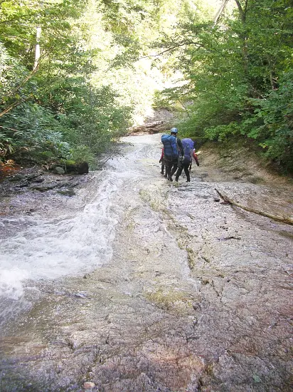 どんどん下って行くと三俣に出る。出合いには3条に水を落とす滝がかかっていて懸垂で降りる。真ん中の沢はしょぼいが下から見て一番左の沢は見事な滝で出合っている。そこからは長いナメが続くようになる。魚沢のナメは赤岩沢のナメ以上に長く素晴らしい。時々出てくる滝はよく探せば巻き道があるのだろうが上からだとよく分からないので懸垂を多用した。